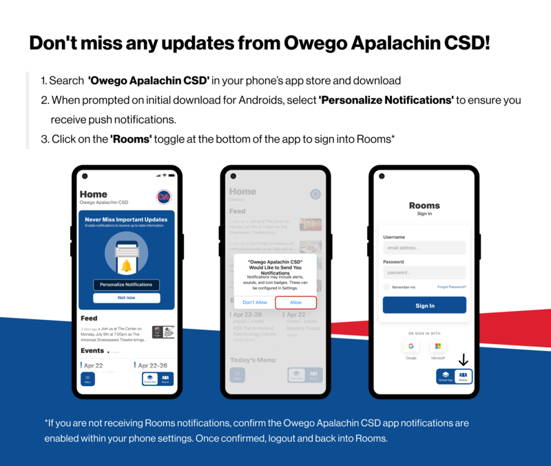 Now, Owego Apalachin CSD is making it easier to stay in touch with teachers and class information from that same app. Using the Owego Apalachin CSD app you can easily switch from district and school information to Rooms, where you can see your student's classes and engage directly with teachers. Rooms can be accessed via the web and from our district app, which is available for free and can be used from both Apple and Android phones.